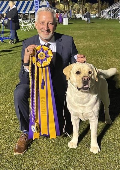 Notably, Maverick won WD and BOW at his very first show at 7 months old He went on to become a Champion at 13 months and a Grand Champion before he was 2, all with limited showing. In January 2023, he won winning BOB, BISS against 96 Labradors at the Southern California LRC Specialty (photo above)